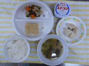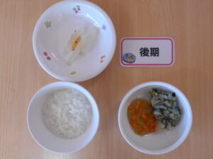 後期:たらと小松菜の煮物/人参と胡瓜の和え物/だいこん/軟飯