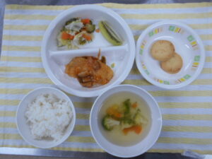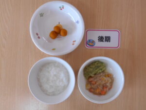 後期:ツナと人参の味噌煮/ブロッコリーとキャベツのサラダ/かぼちゃ/軟飯