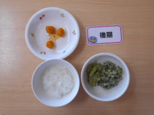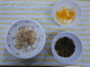 11月17日(月)の献立 投稿日時: 2025年11月17日 投稿者: tenryu-lunch 11月17日(月)の献立 ・豚丼 ・ほうれん草と玉ねぎの味噌汁 ~おやつ~ ・フルーツ牛乳寒天 <離乳食> 後期:ほうれん草のそぼろ煮/ブロッコリーとじゃが芋のサラダ/かぼちゃ/軟飯