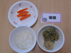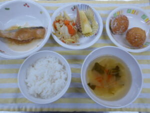 11月26日(水)の献立 投稿日時: 2025年11月26日 投稿者: tenryu-lunch 11月26日(水)の献立 ・ごはん ・魚のおろし煮 ・チンゲン菜と玉ねぎのスープ ・キャベツとしらすのサラダ ・りんご ~おやつ~ ・豆腐ドーナツ <離乳食> 後期:ツナとチンゲン菜の煮物/キャベツともやしの和え物/にんじん/軟飯