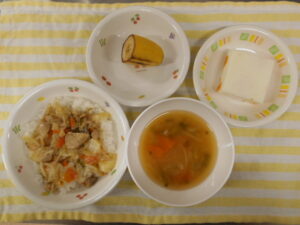12月4日(木)の献立 投稿日時: 2025年12月4日 投稿者: tenryu-lunch 12月4日(木)の献立 ・鶏肉と野菜の照り焼き丼 ・人参と切干大根の味噌汁 ・バナナ ~おやつ~ ・牛乳みかん寒天 <離乳食> 後期:ツナとキャベツの煮物/人参といんげんの和え物/バナナ/軟飯