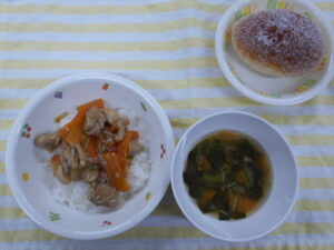 12月15日(月)の献立 投稿日時: 2025年12月15日 投稿者: tenryu-lunch 12月15日(月)の献立 ・野菜炒め丼 ・ほうれん草とえのきの味噌汁 ~おやつ~ ・揚げパン <離乳食> 後期:鶏肉とピーマンのあんかけ/かぼちゃと人参の和え物/軟飯