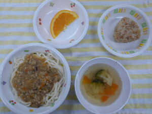 12月18日(木)の献立 投稿日時: 2025年12月18日 投稿者: tenryu-lunch 12月18日(木)の献立 ・そふとめん(肉みそ味) ・人参とブロッコリーのスープ ・オレンジ ~おやつ~ ・おかかおにぎり <離乳食> 後期:鶏肉と玉ねぎのあんかけ/もやしとブロッコリーのサラダ/オレンジ/軟飯