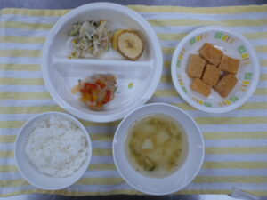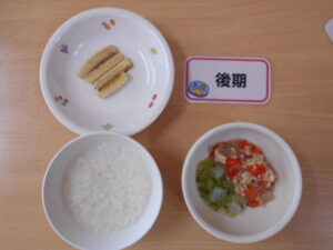 後期:鶏肉ともやしの煮物/大根と胡瓜の和え物/バナナ/軟飯