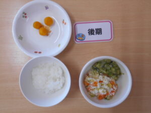 後期:白菜と豆腐の煮物/もやしとブロッコリーの和え物/かぼちゃ/軟飯