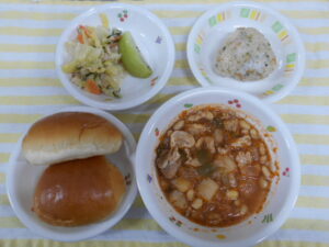 1月30日(金)の献立 投稿日時: 2026年1月30日 投稿者: tenryu-lunch 1月30日(金)の献立 ・ロールパン ・ポークビーンズ ・キャベツのツナマヨサラダ ・キウイ ~おやつ~ ・たぬきおにぎり <離乳食> 後期:ツナとピーマンの煮物/じゃがいもと胡瓜の和え物/にんじん/軟飯