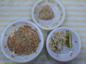後期:大根のそぼろ煮/もやしと胡瓜の和え物/ふかし芋/軟飯
