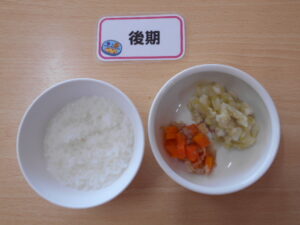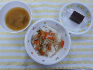 2月24日(火)の献立 投稿日時: 2026年2月24日 投稿者: tenryu-lunch 2月24日(火)の献立 ・てりやき野菜丼 ・じゃが芋とわかめの味噌汁 ~おやつ~ ・水ようかん <離乳食> 後期:豆腐とキャベツの煮物/もやしと人参のサラダ/軟飯
