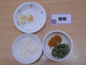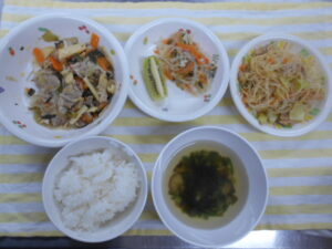 後期たらとたまねぎの煮物/人参と胡瓜のサラダ/ふかし芋/軟飯