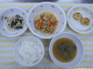 3月30日(月)の献立 投稿日時: 2026年3月30日 投稿者: tenryu-lunch 3月30日(月)の献立 ・鶏肉と大豆の煮物 ・青菜となめこの味噌汁 ・だいこんと胡瓜のツナマヨサラダ ・ヨーグルト ~おやつ~ ・じゃがもち <離乳食> 初期:豆腐ペースト/ほうれん草ペースト/じゃがいもペースト/粥