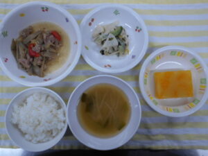 4月20日(月)の献立 投稿日時: 2026年4月20日 投稿者: tenryu-lunch 4月20日(月)の献立 ・ごはん ・豚肉とごぼうの炒め物 ・チンゲン菜としめじの味噌汁 ・大根とわかめのマヨポン和え ・ヨーグルト ~おやつ~ ・オレンジゼリー <離乳食> 中期:豆腐と赤ピーマンの煮物/もやしと胡瓜のサラダ/オレンジ/粥