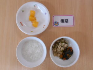 初期・後期:いんげんのそぼろ煮/ほうれん草と人参の和え物/オレンジ/粥・軟飯